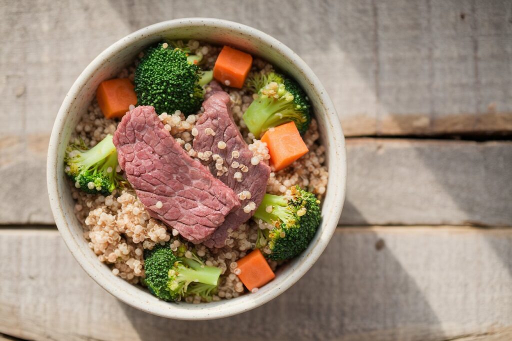 This Beef & Quinoa Bowl is a protein-rich meal with quinoa, a nutritious grain alternative. It’s ideal for dogs with grain sensitivities, thanks to its gluten-free ingredients.