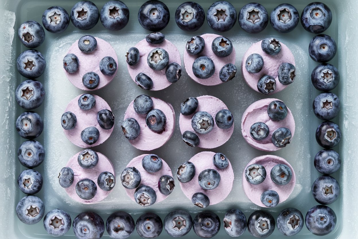 - In an ice cube tray, silicone mold, or mini cupcake tray, drop a couple of blueberries into each section.