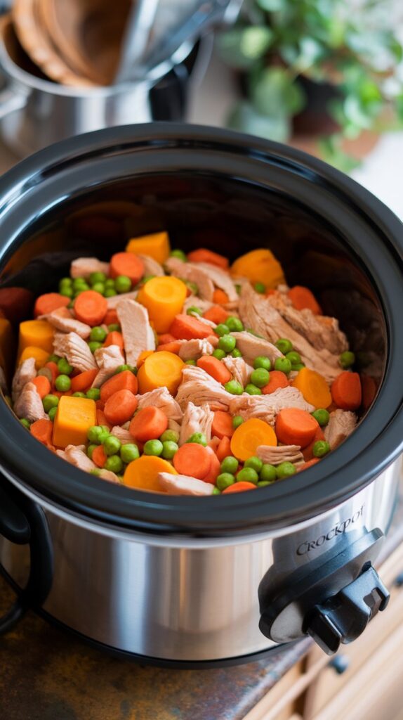 Just throw the chicken, pumpkin, carrots, green beans, peas, and broth into the crockpot.
