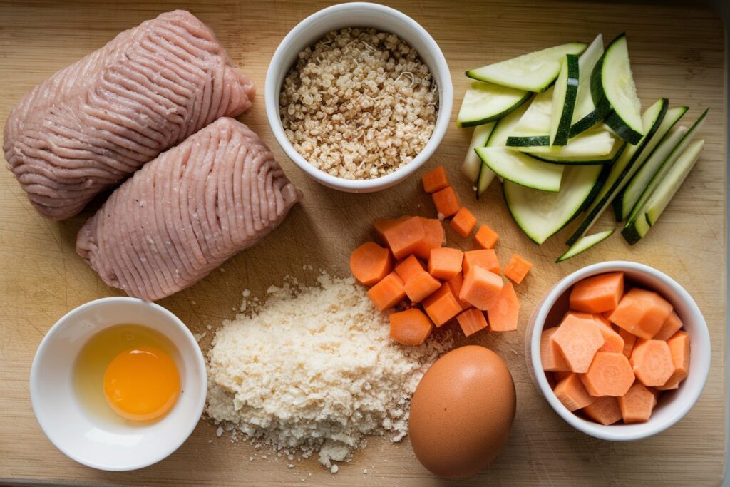 In a large bowl, combine the ground chicken, cooked quinoa, zucchini, peas, and egg. Stir well until everything is evenly mixed. If the mixture feels too wet, add a bit more quinoa to thicken it up.