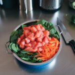- Check the salmon for any bones and cut it into small, bite-sized chunks. If you prefer cooked salmon, lightly sear or bake it without seasoning.