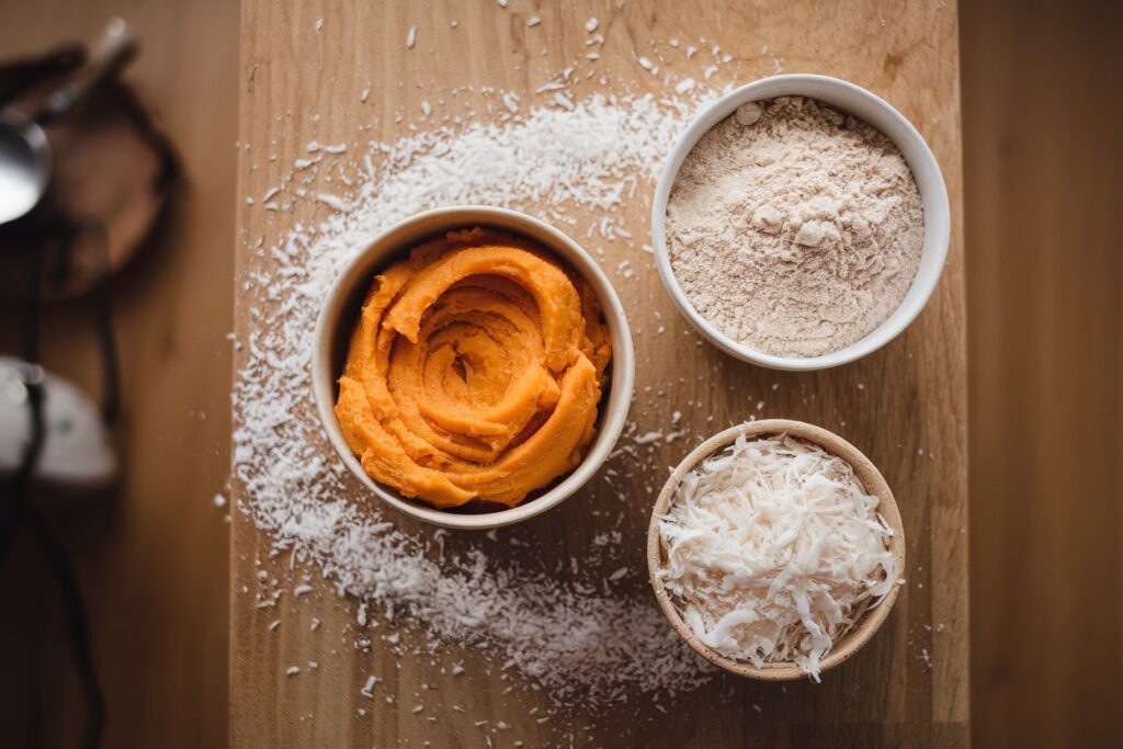In a mixing bowl, combine the mashed sweet potato, coconut flour, and shredded coconut. Stir until a thick dough forms. If it feels too dry, add a small splash of water to help it come together. - Shape into Sticks